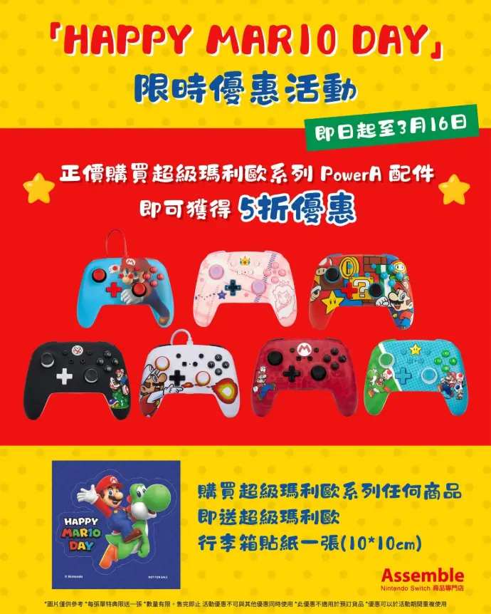 由即日起至3月16日,凡以正價購買以下超級瑪利歐系列商品,即可享有限時優惠: